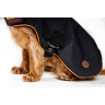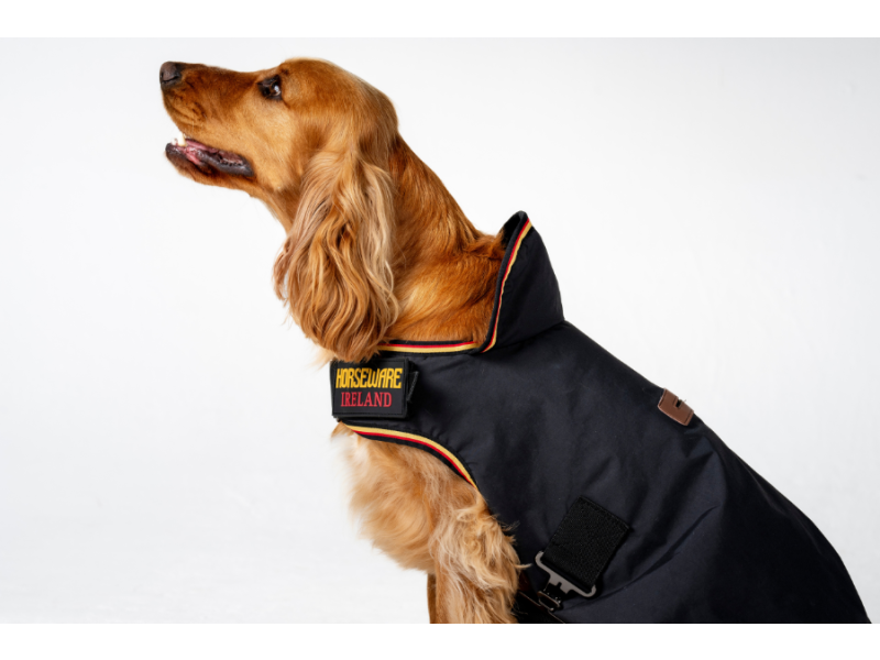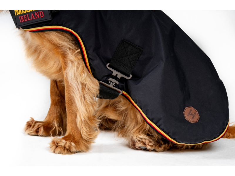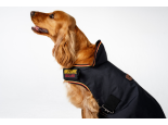 Flot hundedækken med fleece-krave. Lukning under maven samt foran. Åbning i ryggen til hundesnor.